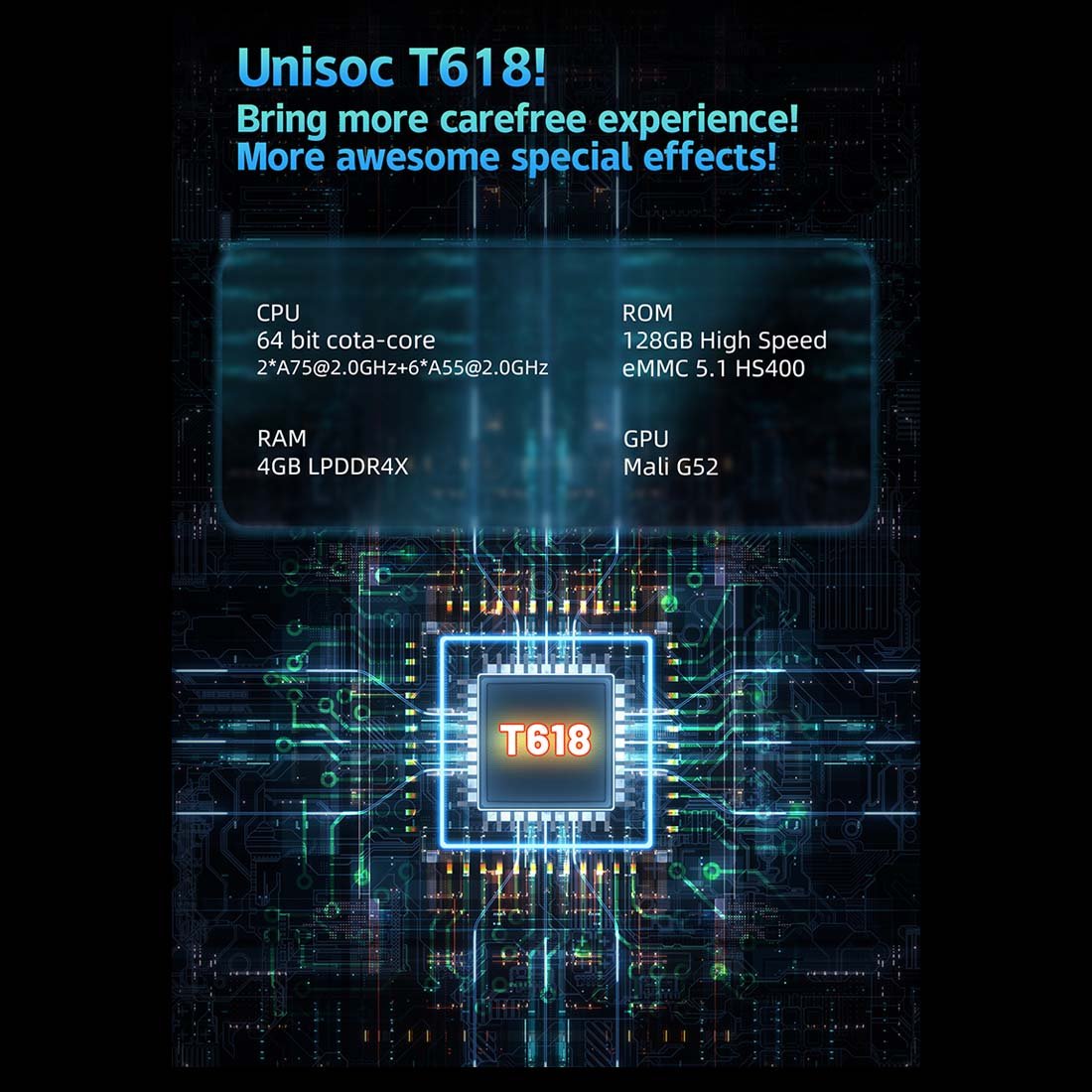 Processor: Unisoc Tiger T618 octa-core (2x A75 @2.0GHz + 6x A55 @2.0GHz)