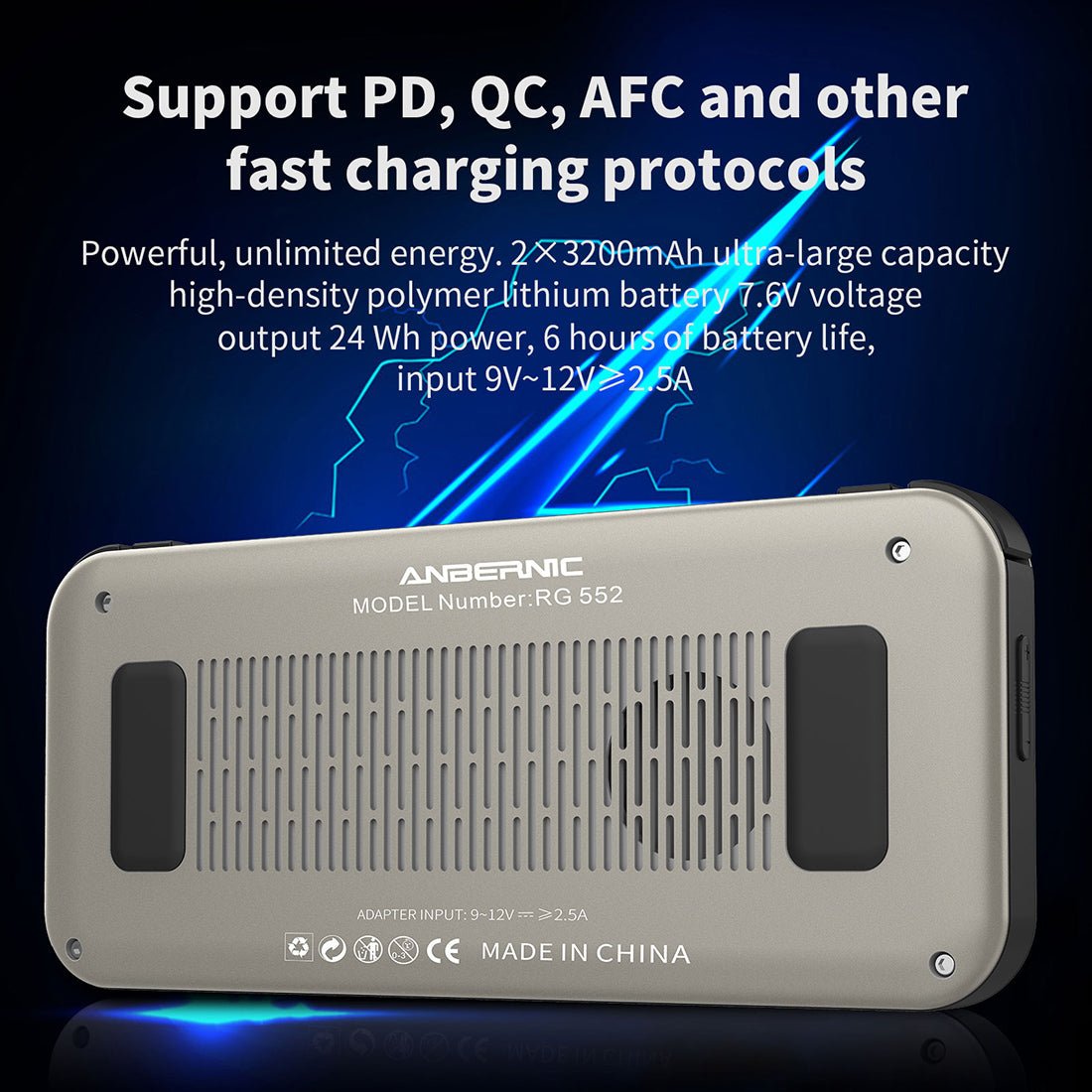Battery: 2×3200mAh (7.6V, 24Wh), 6 hours use, PD/QC/AFC fast charge supported